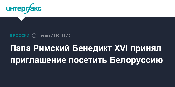 Минск. 7 июля. ИНТЕРФАКС-ЗАПАД - Папа Римский Бенедикт XVI принял приглашение белорусского президента Александра Лукашенко посетить Белоруссию, сообщил в воскресенье вечером Первый национальный телеканал.