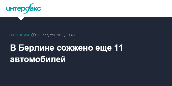 Берлин. 19 августа. INTERFAX.RU - Неизвестные в ночь на пятницу сожгли одиннадцать автомобилей в районах Трептов и Кепеник на востоке Берлина и Моабит и Кройцберг в центральной части города, сообщает в четверг немецкая газета Berliner Morgenpost.