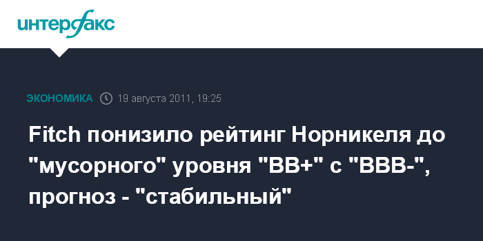 Лондон/Москва. 19 августа. INTERFAX.RU - Международное рейтинговое агентство Fitch Ratings понизило долгосрочный рейтинг дефолта эмитента (РДЭ) ОАО "Норильский никель" (РТС: GMKN), а также его рейтинг приоритетных необеспеченных облигаций до уровня "ВВ+" с "ВВВ-", сообщается в пресс-релизе агентства.