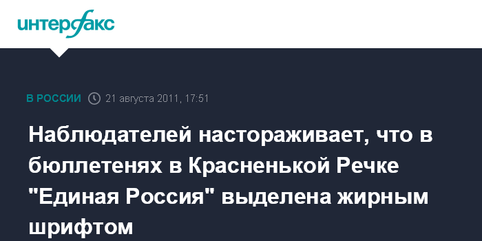 Санкт-Петербург. 21 августа. INTERFAX.RU - Наблюдатели, следящие за соблюдением закона на выборах в МО "Красненькая Речка", намерены разобраться, не является ли нарушением тот факт, что название партии "Единая Россия" в бюллетенях выделено жирным шрифтом.