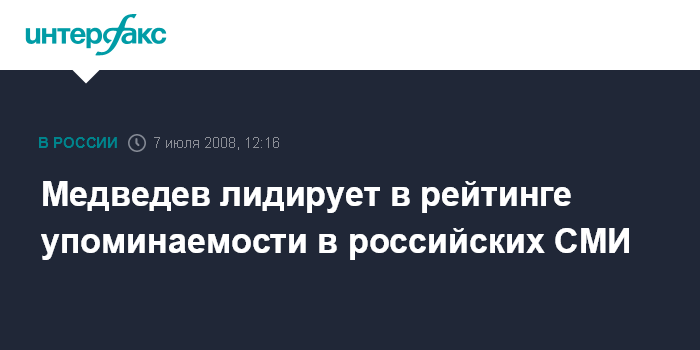 Москва. 7 июля. INTERFAX.RU – Президент РФ Дмитрий Медведев на прошедшей неделе возглавил рейтинг упоминаемости персоналий в российских СМИ, свидетельствуют данные "Системы комплексного анализа новостей" (СКАН), созданной "Интерфаксом".