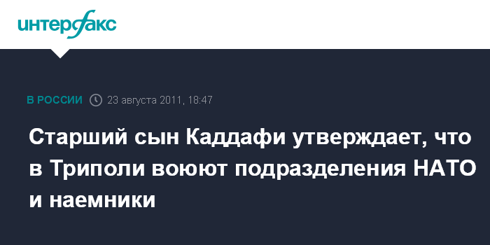 Москва. 23 августа. INTERFAX.RU - Старший сын ливийского лидера Муамара Каддафи Мухаммед заявил об участии в боях против верным им сил в Триполи подразделений НАТО.