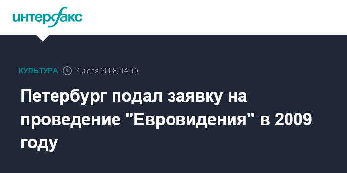 Москва. 7 июля. INTERFAX.RU - Власти Петербурга подали заявку на проведение финала конкурса "Евровидение" в 2009 г. в Северной столице.