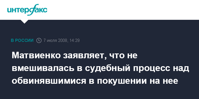 Москва. 7 июля. INTERFAX.RU - Губернатор Петербурга Валентина Матвиенко заявляет, что отстраненно и "не вмешиваясь" наблюдала за судебным процессом над обвинявшимися в подготовке покушения на нее.