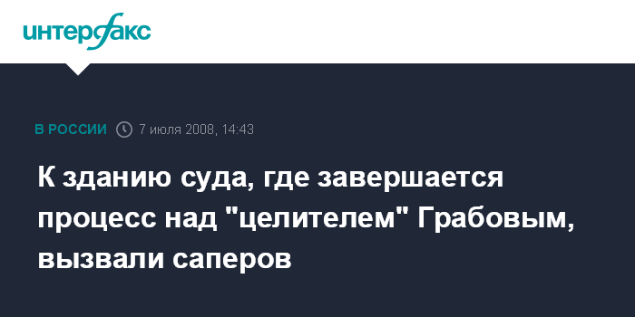 Москва. 7 июля. INTERFAX.RU - У здания Таганского суда, где должны огласить приговор "целителю" Григорию Грабовому, найден подозрительный предмет. Как передает корреспондент "Интерфакса", на выступе здания суда был обнаружен подозрительный ящик, после чего сотрудники милиции, обеспечивающие охрану суда, попросили присутствующих отойти на 50 метров и вызвали саперов.