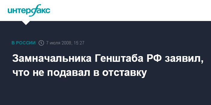 Москва. 7 июля. INTERFAX.RU - Заместитель начальника Генерального штаба Вооруженных сил РФ генерал-полковник Василий Смирнов опроверг информацию, появившуюся в российских СМИ, о том, что он написал рапорт об отставке.