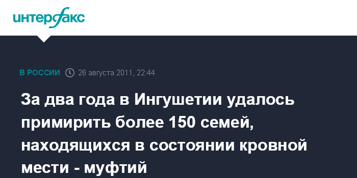 Магас. 26 августа. ИНТЕРФАКС - За последние два года благодаря работе примирительной комиссии в Ингушетии от кровной вражды отказались более 150 представителей местных фамилий, заявил в Магасе муфтий Ингушетии Иса Хамхоев.