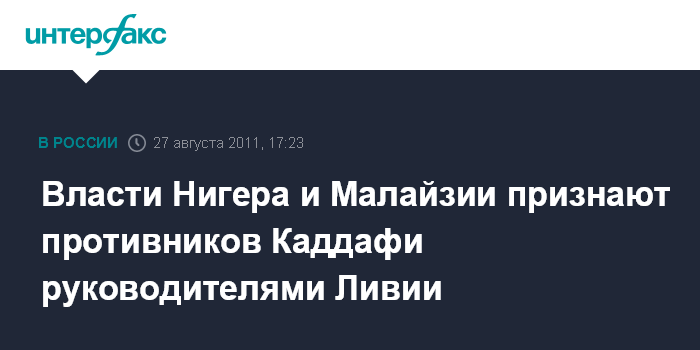 Каир/Рим. 27 августа. INTERFAX.RU - Руководство Нигера объявило в субботу, что признает Национальный переходный совет единственным законным органом власти в соседней Ливии. "Правительство Нигера принимает к сведению произошедшие в Ливии изменения и официально признает НПС единственным законным органом власти", - говорится в коммюнике кабинета министров, прочитанном в эфире государственного радио.
