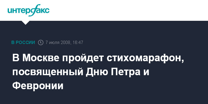Москва. 7 июля. INTERFAX.RU - В День семьи, любви и верности, который впервые будет отмечаться в России так широко и официально, 8 июля в Москве состоится стихомарафон, на котором столичные поэты прочтут стихи о любви, сообщил "Интерфаксу" организатор акции Александр Герасимов. "Два десятка московских поэтов причтут стихи, объединенные одной, пожалуй, главной и самой понятной для большинства людей темой. Они прочтут стихи о любви", - рассказал он.