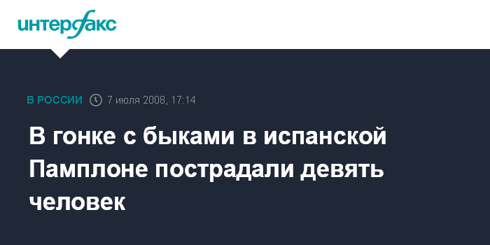 Москва. 7 июля. INTERFAX.RU - Девять человек получили травмы в первый день знаменитого праздника Сан-Фермин, который проходит в испанском городе Памплоне. Во время этого праздника по улицам города обычно пускают разъяренных быков, от которых убегают люди, желающие показать смелость.