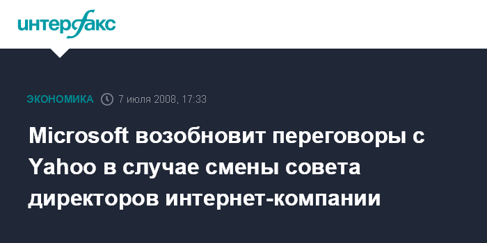 Москва. 7 июля. INTERFAX.RU - Microsoft Corp. может возобновить переговоры о слиянии с Yahoo! в случае смены совета директоров интернет-компании, передает Bloomberg.