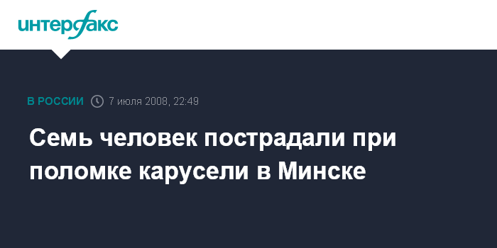 Минск. 7 июля. ИНТЕРФАКС-ЗАПАД - В парке отдыха Минска при аварии аттракциона пострадали семь человек, сообщили "Интерфаксу" в РОВД Первомайского района столицы Белоруссии.