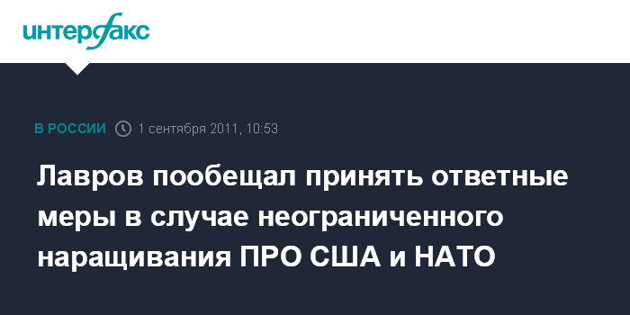 Москва.1 сентября. INTERFAX.RU - Глава МИД РФ Сергей Лавров предупредил США и НАТО, что ничем не ограниченное наращивание системы ПРО потребует от России ответных мер для защиты стратегического потенциала сдерживания.