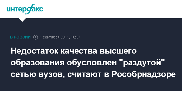 Нижний Новгород. 1 сентября. INTERFAX.RU - Руководитель Федеральной службы по надзору в сфере образования и науки (Рособрнадзор) Любовь Глебова обращает внимание на "раздутую" сеть высших учебных заведений в России.