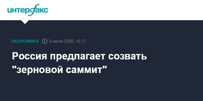 Москва. 8 июля. INTERFAX.RU - Россия на саммите "восьмерки" предложила идею созыва "зернового" саммита как одну из мер для решения вопроса продовольственной безопасности, сообщил президент России Дмитрий Медведев.