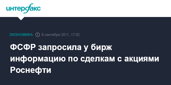 Москва. 8 сентября. INTERFAX.RU - Федеральная служба по финансовым рынкам (ФСФР) запросила у бирж информацию по сделкам с акциями Роснефти в связи с их ростом 29 и 30 августа, сообщил агентству "Интерфакс-АФИ" глава ФСФР Дмитрий Панкин.