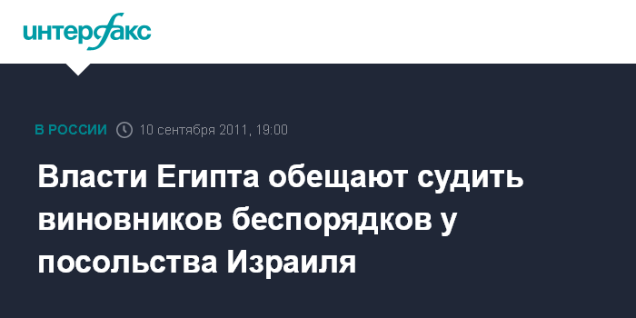 Лондон. 10 сентября. INTERFAX.RU - Власти Египта заявили, что виновные в погроме у израильского посольства предстанут перед чрезвычайным судом безопасности, сообщает в субботу британская телерадиокорпорация Би-би-си. Заявление министра информации Египта Осамы Хасана Хейкаля по национальному телевидению прозвучало после того, как правительства США и ряда других стран выступили с осуждением штурма диппредставительства Израиля в Каире.