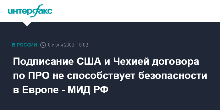 Москва. 8 июля. INTERFAX.RU - Соглашение о развертывании элементов американской ПРО на чешской территории, подписанное США и Чехией, осложняет обеспечение европейской глобальной безопасности. "Сделан шаг, который давно анонсировался и который, на наш взгляд, не прибавил безопасности на европейском континенте. К тому же осложняет проблемы безопасности в глобальном измерении", - заявил "Интерфаксу" высокопоставленный представитель министерства иностранных дел России.