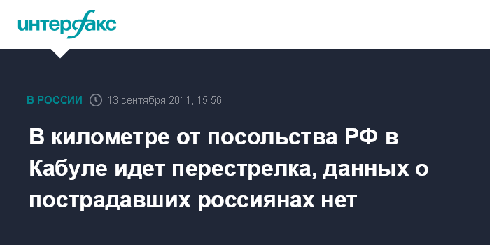Москва. 13 сентября. INTERFAX.RU- Посольство России в Афганистане пока не располагает информацией о россиянах, которые могли пострадать в результате нападения экстремистов на Кабул.