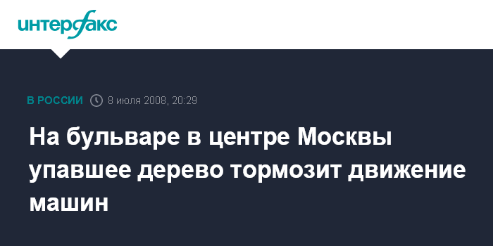 Москва. 8 июля. ИНТЕРФАКС-МОСКВА - В центре Москвы в результате порыва ветра на проезжую часть упало дерево, сообщили "Интерфаксу" источники в столичном МЧС.
