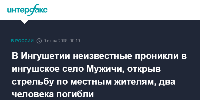 "Около 22:30 мск вооруженные люди, до 15 человек, зашли в село Мужичи и открыли огонь, по предварительным данным, убив двоих местных жителей и одного ранив", - сообщили агентству "Интерфакс-Юг" в штабе объединенной группировки войск на Северном Кавказе.