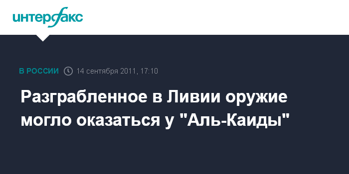 Санкт-Петербург.14 сентября. INTERFAX.RU - Вооружение с военных складов, разграбленных в Ливии, вероятно, попало в руки боевиков "Аль-Каиды", заявил директор департамента по вопросам новых вызовов и угроз МИД РФ Илья Рогачев.