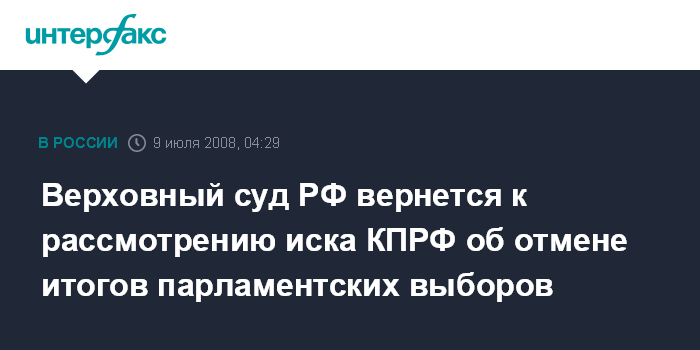 Москва. 9 июля. ИНТЕРФАКС - Верховный суд РФ в среду продолжит слушание по существу иска КПРФ с требованием об отмене результатов прошедших выборов в Госдуму.