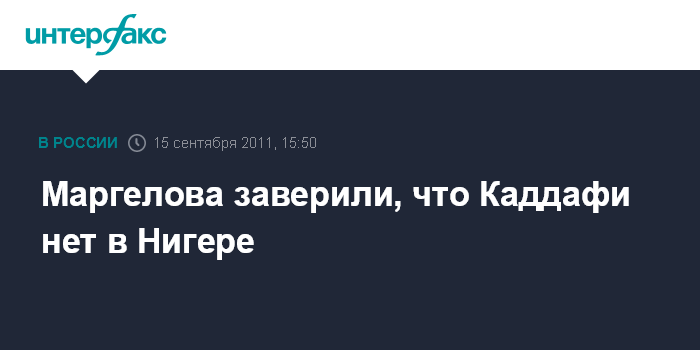 Москва. 15 сентября. INTERFAX.RU - Власти Нигера заявили спецпредставителю президента РФ по Африке Михаилу Маргелову о том, что Муамар Каддафи не находится на их территории.