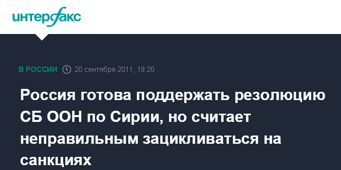 Нью-Йорк. 20 сентября. INTERFAX.RU - Глава МИД России Сергей Лавров называет неправильным стремление некоторых стран зацикливаться на санкциях при обсуждении сирийского вопроса. "Мы не только готовы поддержать резолюцию по Сирии, у нас есть и своей проект", - заявил он российским журналистам во вторник в ООН.