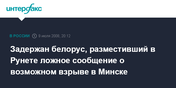 Минск. 9 июля. ИНТЕРФАКС-ЗАПАД - Правоохранительные органы Белоруссии задержали жителя Витебской области, разместившего на одном из российских сайтов знакомств информацию о возможном взрыве в Минске.