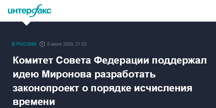 Москва. 9 июля. ИНТЕРФАКС - Комитет по промышленной политике Совета Федерации поддерживает концепцию законопроекта, касающегося порядка исчисления времени на территории РФ, принятие которого инициирует спикер верхней палаты Сергей Миронов.