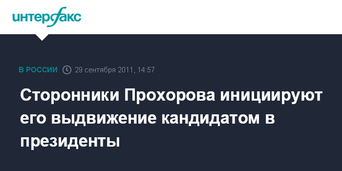 Москва. 29 сентября. INTERFAX.RU- Инициативная группа граждан выступила в поддержку выдвижения кандидатуры Михаила Прохорова в президенты России. Соответствующее обращение размещено в четверг на сайте, посвященном этой теме.