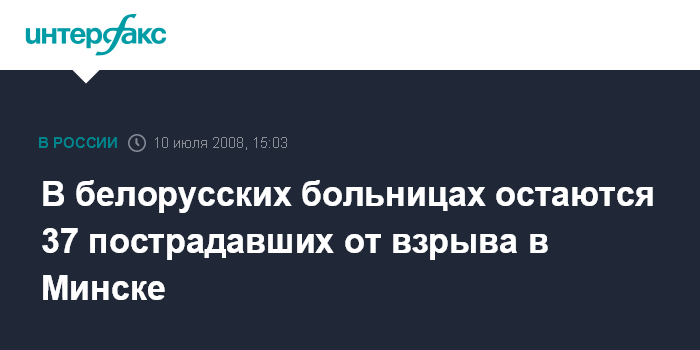 Москва. 10 июля. INTERFAX.RU - В больницах Минска и Витебска остаются 37 человек, которые пострадали в результате взрыва, произошедшего возле стелы "Минск - город-герой". "В настоящее время в больницах находятся 37 пострадавших. В минувшую среду из РНПЦ ортопедии и травматологии были выписаны два человека", - сообщили агентству "Интерфакс" в министерстве здравоохранения.