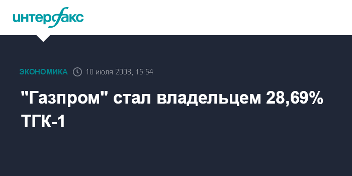 Москва. 10 июля. INTERFAX.RU - ОАО "Газпром" стало непосредственным владельцем 28,69% акций ОАО "Территориальная генерирующая компания-1" (Санкт-Петербург, ТГК-1), говорится в сообщении газового концерна.
