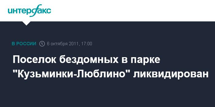 Москва. 6 октября. INTERFAX.RU - Ликвидировано поселение бездомных на территории природно-исторического парка "Кузьминки-Люблино", сообщили "Интерфаксу" в пресс-службе департамента природопользования и охраны окружающей среды Москвы.