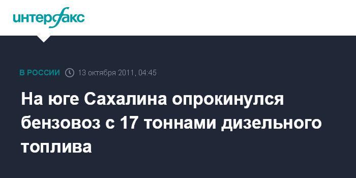 Южно-Сахалинск. 13 октября. ИНТЕРФАКС-ДАЛЬНИЙ ВОСТОК - Бензовоз с дизтопливом опрокинулся не далеко от города Макаров.