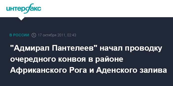 "16 октября в 21:30 (мск) большой противолодочный корабль Тихоокеанского флота "Адмирал Пантелеев" приступил к проводке конвоя в количестве 5 судов через опасные районы морского пиратства в районе Африканского рога и Аденского залива", - говорится в сообщении официального представителя управления пресс-службы и информации Минобороны РФ по ВМФ, поступившем в "Интерфакс".