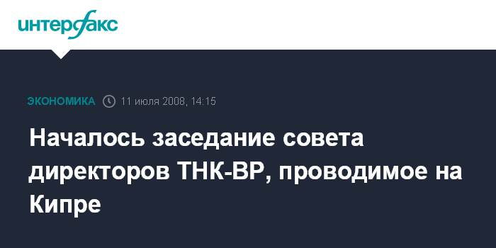 Москва. 11 июля. INTERFAX.RU - Заседание совета директоров ТНК-BP, проводимое на Кипре, началось в пятницу утром, сообщил Агентству нефтяной информации (АНИ) источник, знакомый с ситуацией.