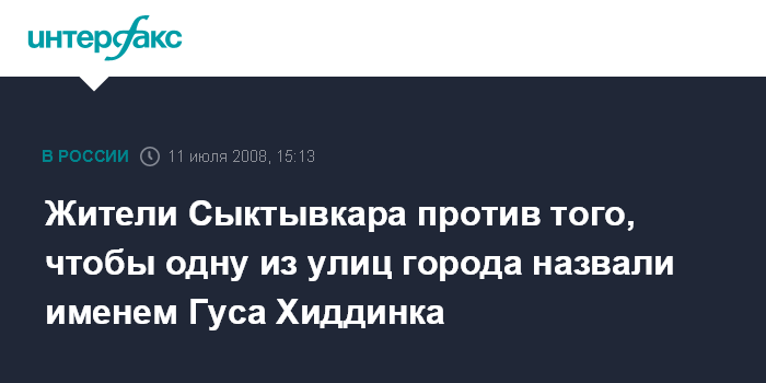 Москва. 11 июля. INTERFAX.RU - Сыктывкарцы выступают против переименования улицы 8 марта в улицу имени Гуса Хиддинка. Таквы данные опроса, проведенного среди жителей улицы по оценке идеи одной из инициативных груп фанатов футбола.
