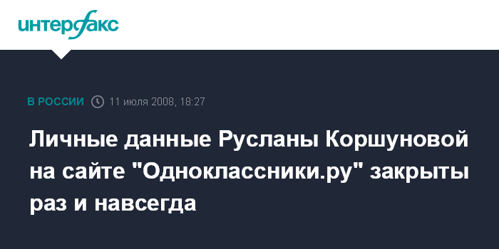 Москва. 11 июля. INTERFAX.RU - Руководство сайта "Одноклассники.ру" приняло решение о закрытии персональной страницы модели Русланы Коршуновой, выпавшей из окна своей квартиры в Нью-Йорке. Как сообщают официальные представители компании, несмотря на поступающие к ним многочисленные просьбы о предоставлении им персональных данных Коршуновой, эта информация никому передаваться не будет. Представители компании отмечают, что личные данные пользователя могут быть переданы третьим лицам только по решению суда.