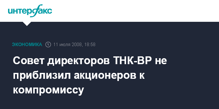 Москва. 11 июля. INTERFAX.RU - Итоги заседания совета директоров ТNК-BP Ltd, которое состоялось в пятницу на Кипре, не приблизили акционеров ТНК (РТС: TNKO)-ВР - британскую ВР и консорциум российских акционеров "Альфа-групп", Access Industries и Renova (AAR) - к компромиссу, сообщил Агентству нефтяной информации (АНИ) источник, близкий к акционерам ТНК.