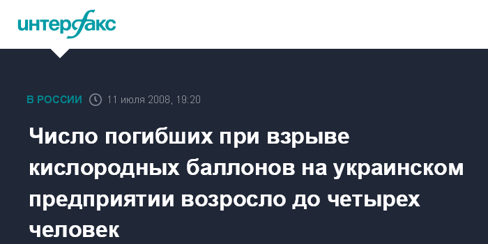 Киев. 11 июля. ИНТЕРФАКС-УКРАИНА - Четверо работников киевского предприятия "Укрвторчермет" погибли в результате взрыва кислородных баллонов.