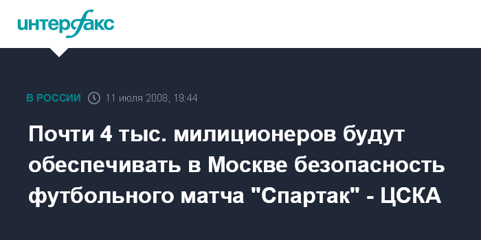 Москва. 11 июля. ИНТЕРФАКС - Порядок в Москве во время 13-го тура чемпионата РФ по футболу между командами "Спартак" (Москва) и ЦСКА, который пройдет 12 июля на Большой спортивной арене "Лужников", будет обеспечивать 3 тысячи 984 сотрудника милиции, сообщили "Интерфаксу" в управлении информации и общественных связей ГУВД по столице.