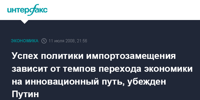 Северодвинск. 11 июля. ИНТЕРФАКС - Премьер-министр РФ Владимир Путин обещает, что правительство постарается как можно скорее перевести российскую экономику на инновационный путь развития, что в полной мере позволит реализовывать политику импортозамещения.