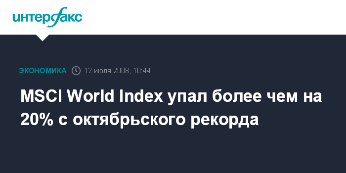 Москва. 12 июля.INTERFAX.RU - MSCI World Index упал в пятницу более чем на 20% с рекордного уровня, который он установил в октябре прошлого года, что характеризует мировой рынок как "медвежий".