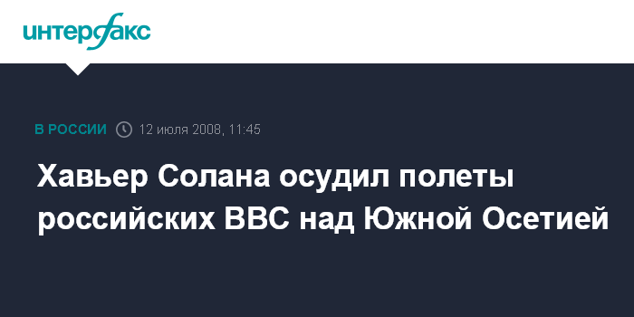 Москва. 12 июля. INTERFAX.RU - Верховный представитель Евросоюза по внешней и оборонной политике Хавьер Солана выразил глубокую озабоченность по поводу пролета российских боевых самолетов над территорией Южной Осетии.