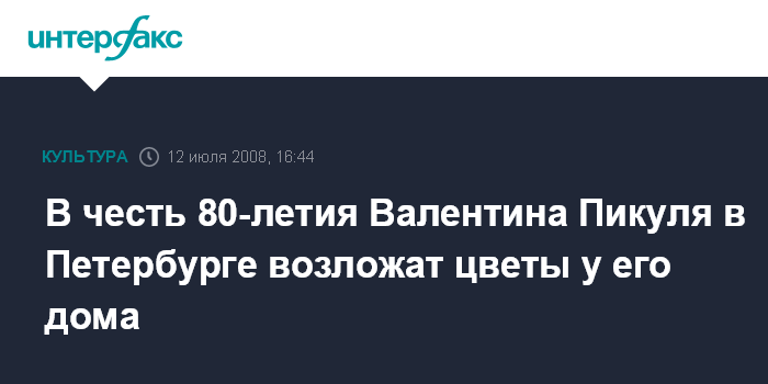 Как сообщил "Интерфаксу" председатель Санкт-Петербургского регионального отделения общероссийского движения поддержки флота Олег Стенько, в этот день вдова В.Пикуля Антонина Пикуль и депутаты Законодательного собрания Санкт-Петербурга возложат цветы к мемориальной доске у дома по 4-ой Красноармейской улице, 16, где жил писатель.
