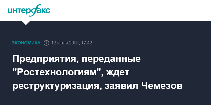 Москва. 12 июля. INTERFAX.RU - Гендиректор "Ростехнологии" Сергей Чемезов заявил, что предприятиям, переданным этой государственной корпорации, предстоит пройти реструктуризацию.