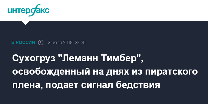 Москва. 12 июля. ИНТЕРФАКС - Экипаж сухогруза "Леманн Тимбер", захваченного в плен сомалийскими пиратами, и освобожденного 8 июля после выплаты выкупа, подал сигнал бедствия.