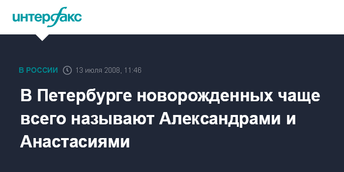 Москва. 13 июля. INTERFAX.RU - Самыми популярными именами, которые дают родители новорожденным, в Петербурге несколько лет подряд остаются Александр и Анастасия.